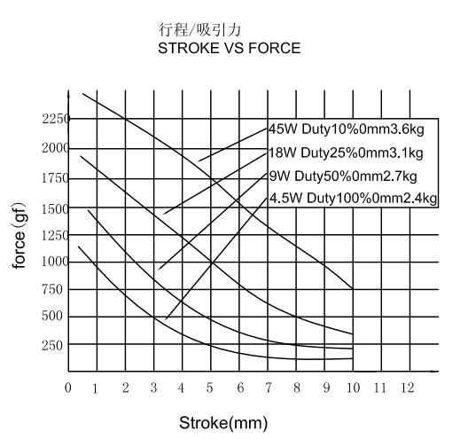 縱向:代表電磁鐵在對(duì)應(yīng)行程時(shí)的力量 單位為克(g)