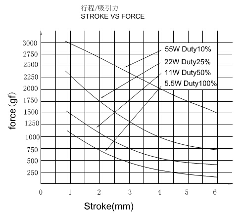 縱向:代表電磁鐵在對應(yīng)行程時的力量 單位為克(g)