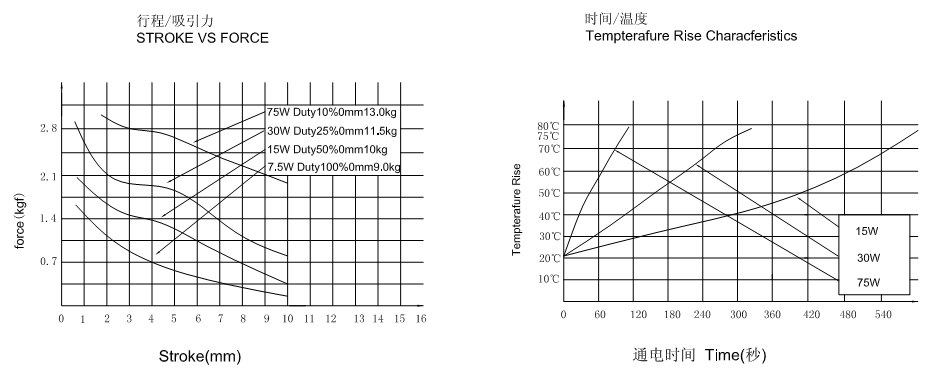 微型電磁鐵U1249的行程和力量曲線圖以及通電時間和溫升曲線圖: